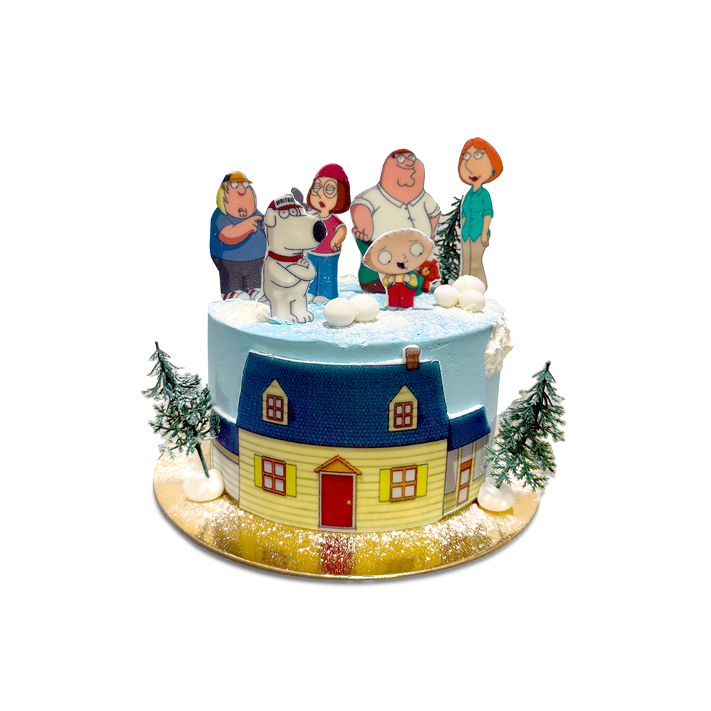 Family Guys is an American cartoon series with dark humor, which tells the story of the everyday life of a strange family, in which American pop culture and lifestyle are often parodied. The cake is covered with white chocolate buttercream, which is decorated with dried sugar wafers and plastic fir trees.