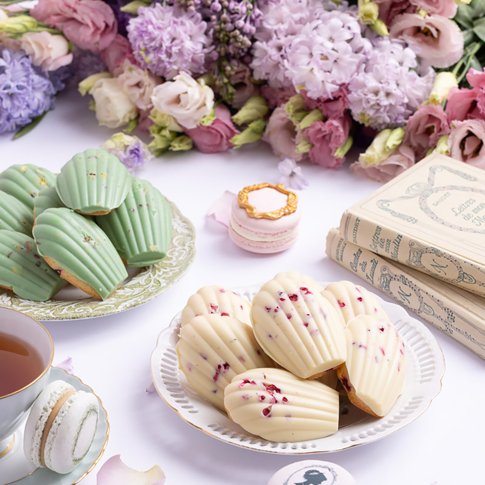 Pistachio madeleines with green Belgian white chocolate coating 990Huf
