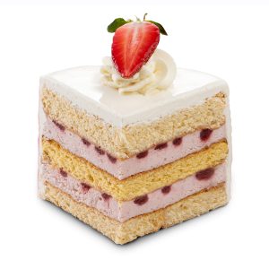 Our strawberry mousse cake is made with soft white sponge, layered with airy strawberry mousse and smooth strawberry jelly. We drizzle the top with glossy white chocolate and decorate it with fresh strawberries and meringues.