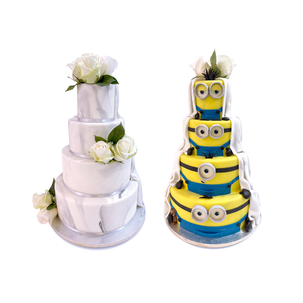 We make a lot of unique wedding cakes, one of the most unique was our two-sided Minion themed wedding cake. One half of the cake looks like a traditional, marbled sugar-coated wedding cake with white roses and fresh flowers. The other half of the cake was requested to be Minion themed. The cake was placed on a rotating stand, which was a big surprise for the wedding party.