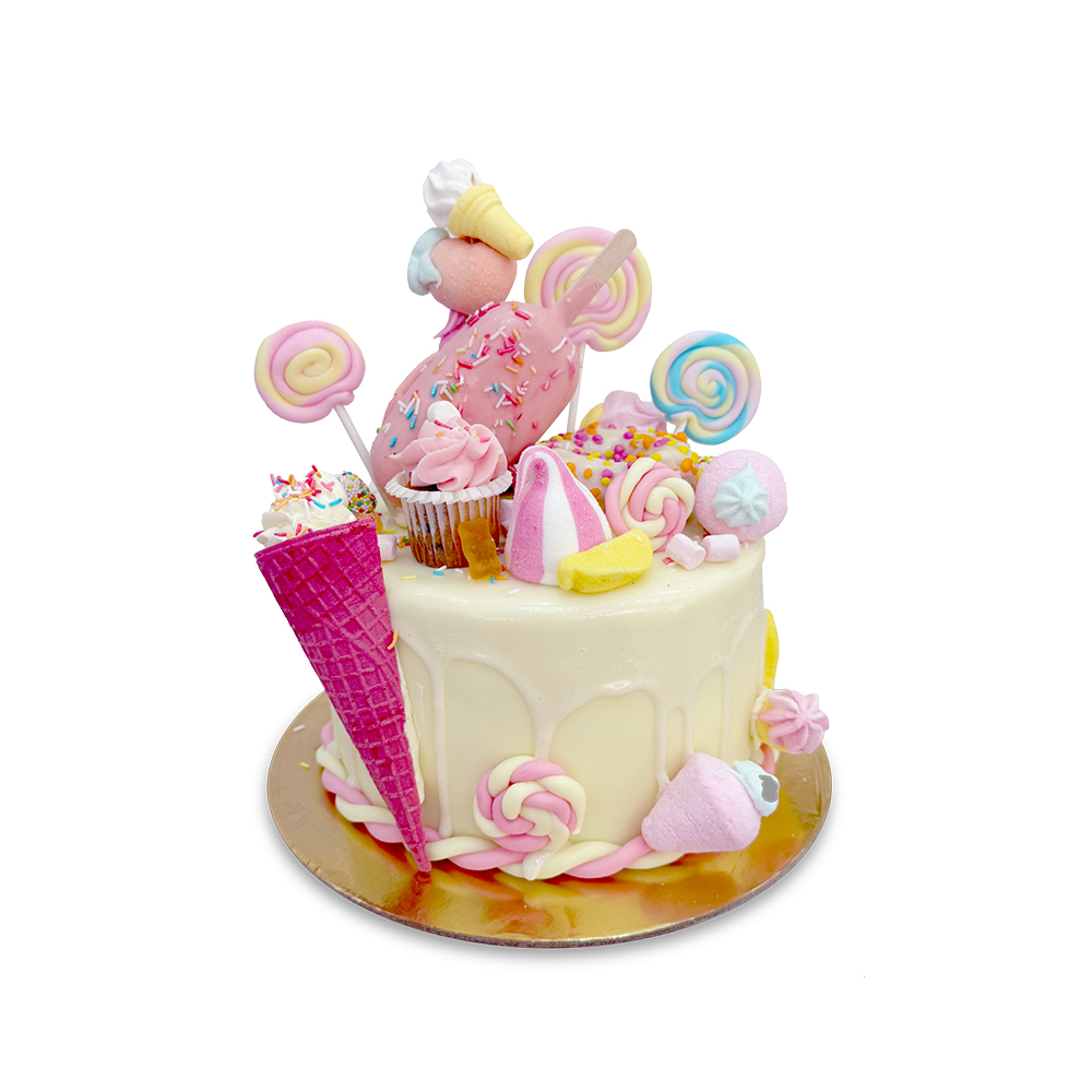 Nagyon látványos szülinapi torta sok-sok édességgel, nyalókával, pillecukrokkal, fánkkal, magnum sütivel és habcsókokkal megpakolva. Az édesség rajongó ünnepeltnek biztos nagy örömet fog okozni!